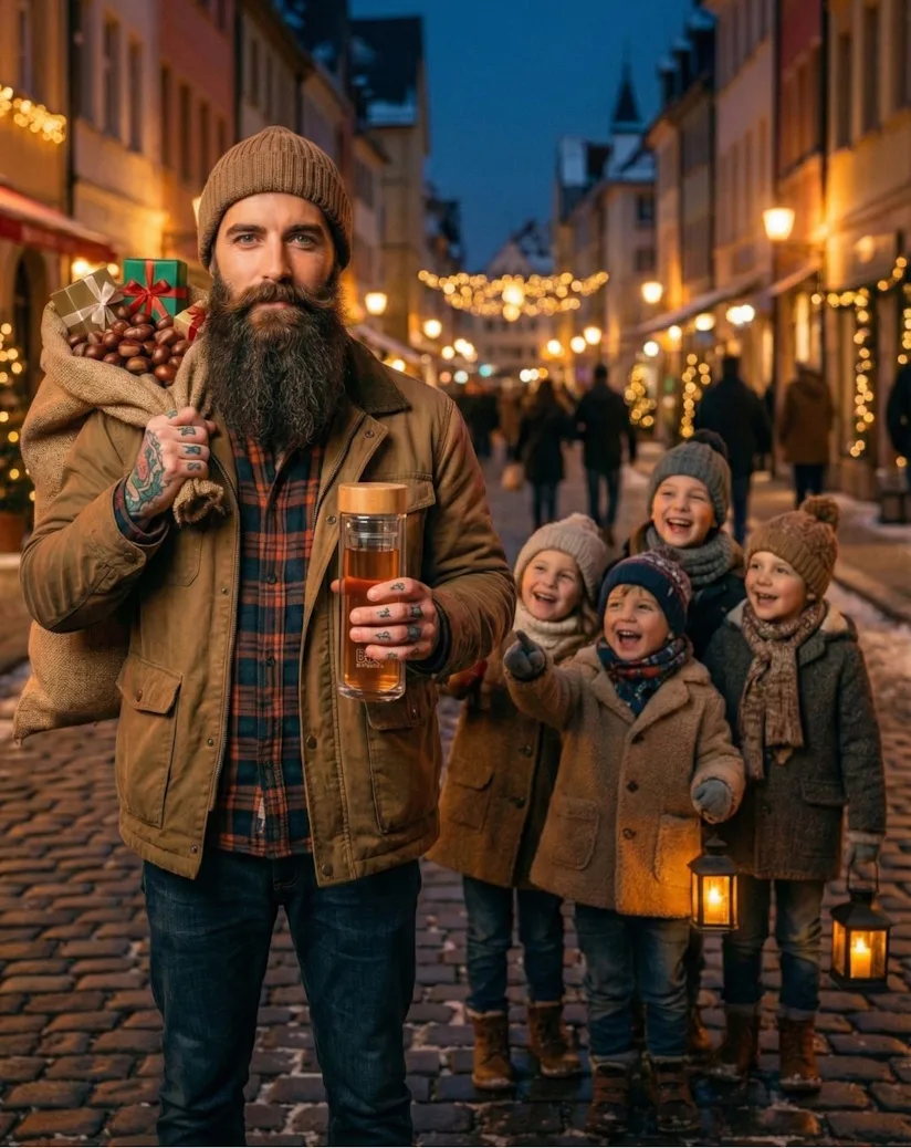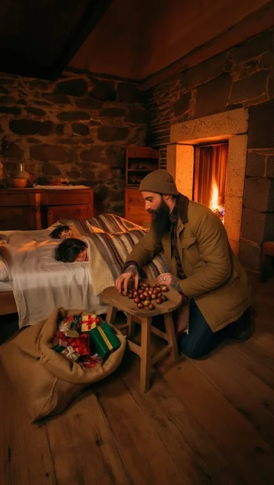 Contan os maiores que é un carboeiro que vive entre os bosques do Courel e Os Ancares, rodeado de árbores, neve e silencio. Pasa o ano recollendo leña, traballando coas mans ennegrecidas polo carbón e agardando o momento en que o solsticio de inverno o chame a baixar do monte. Entón, vístese coa súa roupa humilde, calza as botas gastadas e adéntrase nas aldeas. Non trae grandes agasallos nin promesas envoltas en brillo.