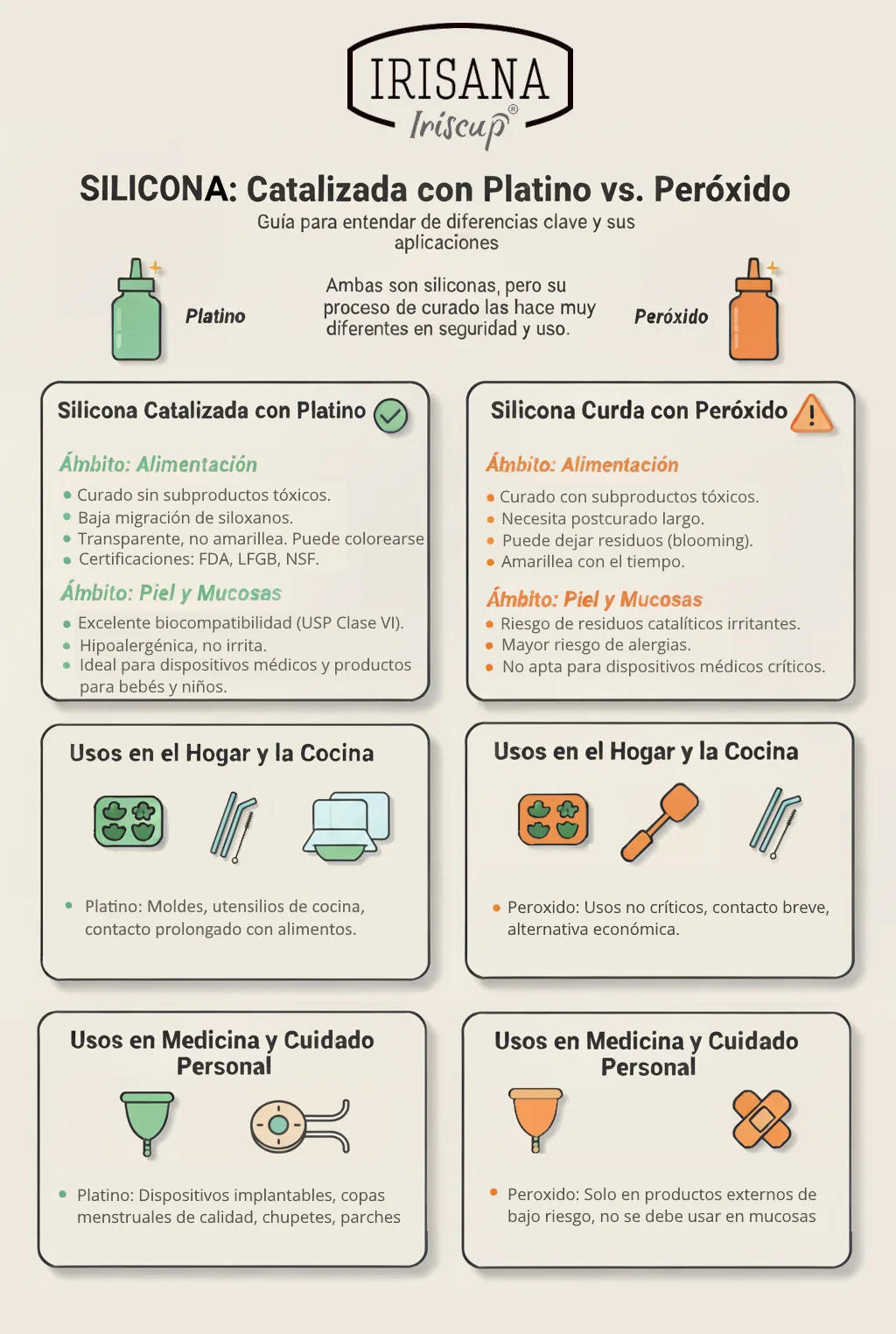 Para contacto con alimentos, piel o mucosas, la silicona platino es la opción más segura y consistente por su pureza, estabilidad térmica y potencial de certificación sanitaria. La silicona de peróxido puede ser válida en aplicaciones técnicas no críticas a temperatura moderada y sin contacto directo prolongado.